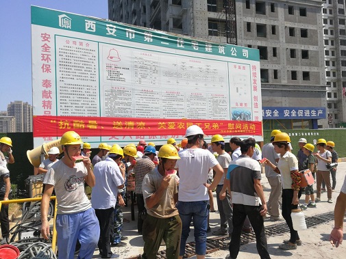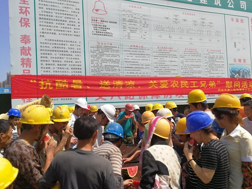 同時(shí)為進(jìn)一步推進(jìn)保障房項(xiàng)目文明施工管理,7月26日上午,公司黨委、工會(huì)、安委會(huì)再次對丈八路保障房項(xiàng)目開展“送清涼·享關(guān)愛”防暑降溫慰問活動(dòng)。將西瓜、綠豆、白糖等防暑降溫用品送達(dá)施工一線的工人手中,并叮囑大家一定要嚴(yán)格執(zhí)行高溫措施,注意勞逸結(jié)合和防暑降溫,切勿麻痹大意造成傷害。長期身處一線職工對公司黨委、工會(huì)和安委會(huì)的關(guān)愛行動(dòng)表示感謝。