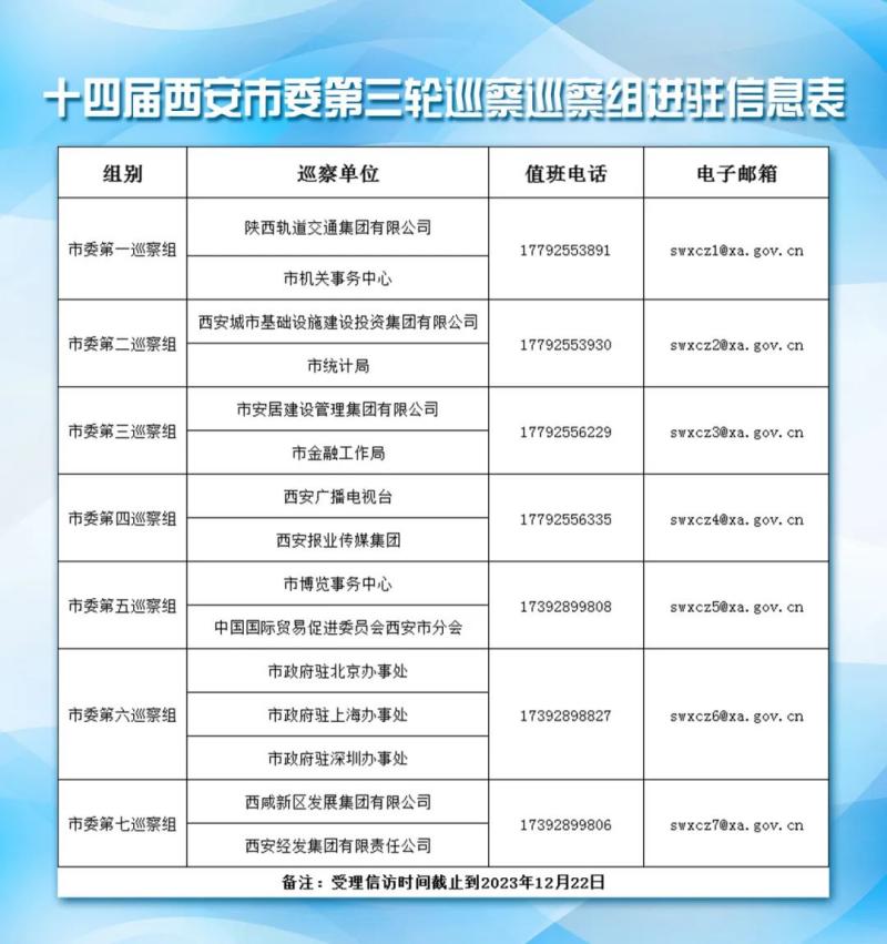 經(jīng)市委批準(zhǔn),十四屆市委第三輪巡察共成立7個(gè)巡察組,分別對(duì)陜西軌道交通集團(tuán)有限公司、市統(tǒng)計(jì)局、市金融工作局、市機(jī)關(guān)事務(wù)中心、市博覽事務(wù)中心、西安報(bào)業(yè)傳媒集團(tuán)、西安廣播電視臺(tái)、中國國際貿(mào)易促進(jìn)委員會(huì)西安市分會(huì)、西安城市基礎(chǔ)設(shè)施建設(shè)投資集團(tuán)有限公司、市安居建設(shè)管理集團(tuán)有限公司、市政府駐北京辦事處、市政府駐上海辦事處、市政府駐深圳辦事處等13家單位開展常規(guī)巡察,對(duì)西咸新區(qū)發(fā)展集團(tuán)有限公司、西安經(jīng)發(fā)集團(tuán)有限責(zé)任公司2家單位開展提級(jí)巡察。